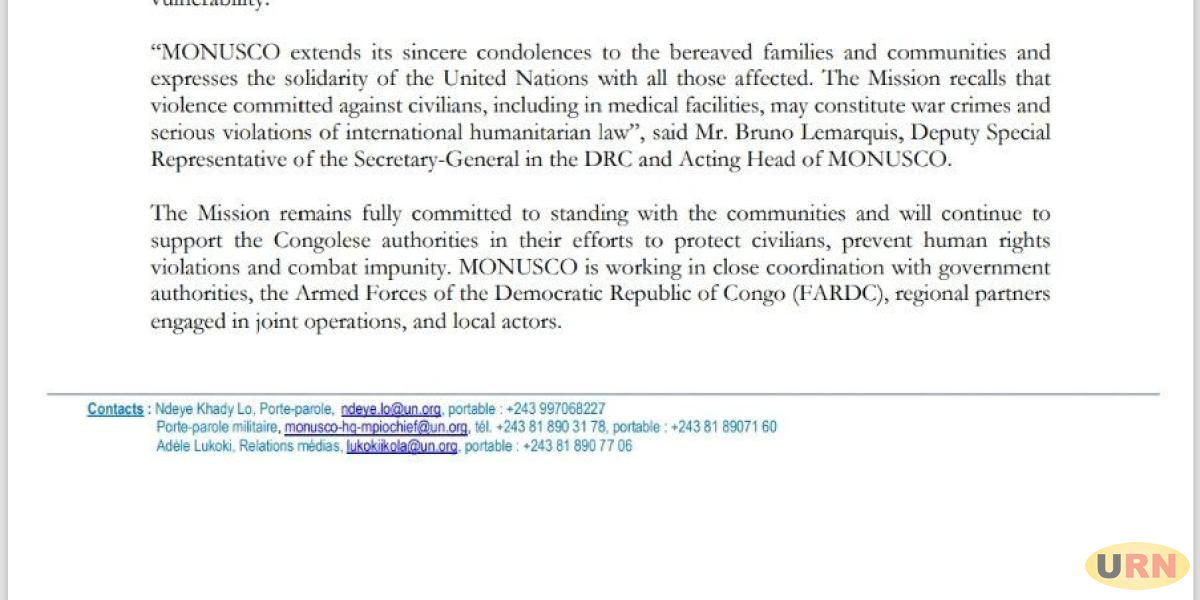 Bruno Lemarquis, the Deputy Special Representative of the Secretary-General in the DRC and Acting Head of MONUSCO, expressed the UN mission’s condolences to the families and communities affected and reaffirmed its solidarity with all victims.