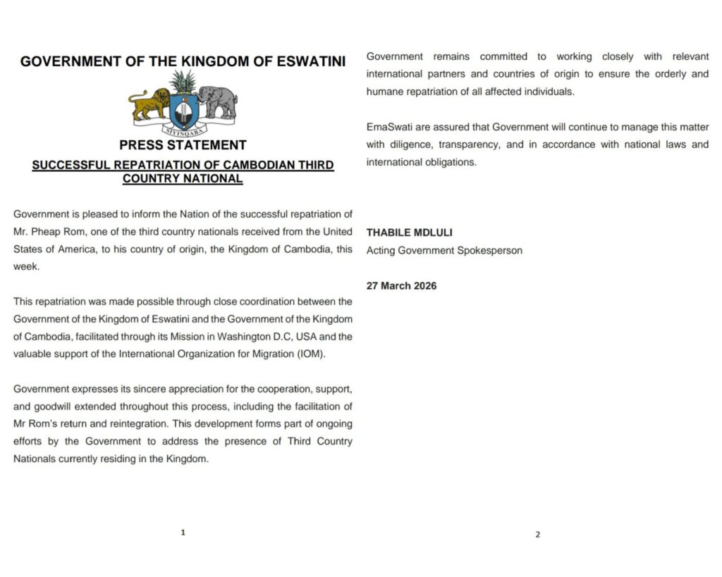 Eswatini — The Government of the Kingdom of Eswatini has announced the successful repatriation of a Cambodian national, Mr. Pheap Rom, to his country of origin.